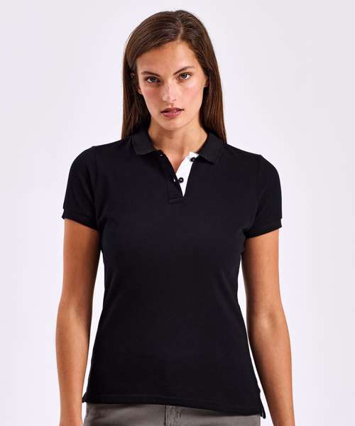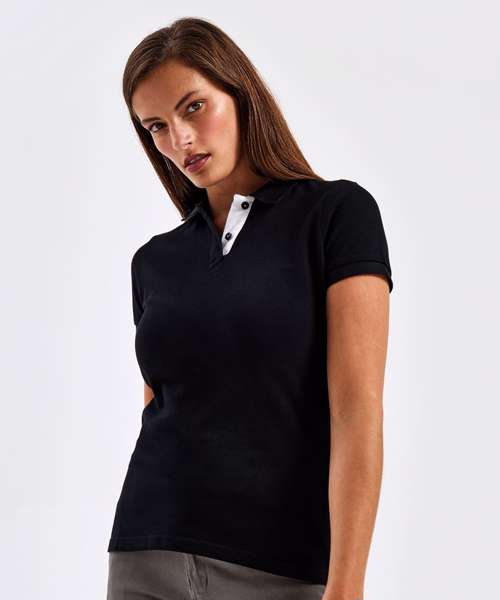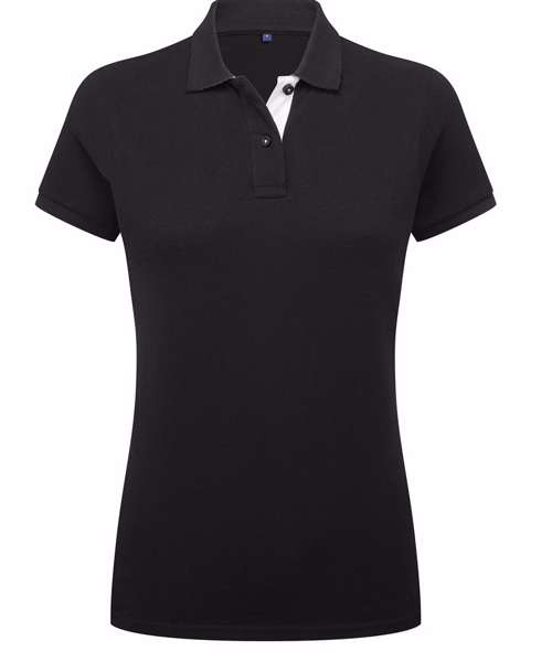 Fitted polo for women with contrast collar and placket. Two contrast coloured buttons on placket. Contrast colour on side vents. Twin needle stitching on hem. Ribbed knit collar and sleeve cuffs. Product contains no branded neck label. Removable Kimble or looped garment tags. Inner seam label holds important product information on one label with a second label containing brand information which can be cut-away. Please note old stock may contain a fixed branded label.