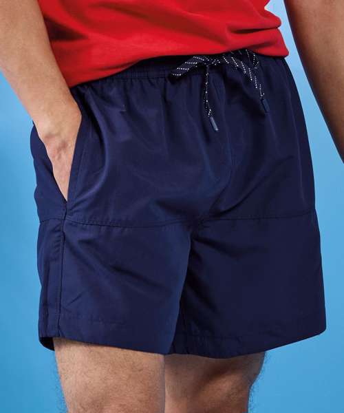Panelled swim shorts. Tie waist. Two eyelets. Striped tie cord with caps. Elasticated waist. Mesh inner lining. Two side pockets. Single zip-fastening pocket on the back. Product contains no branded neck label. Removable Kimble or looped garment tags. Inner seam label holds important product information on one label with a second label containing brand information which can be cut-away. Please note old stock may contain a fixed branded label