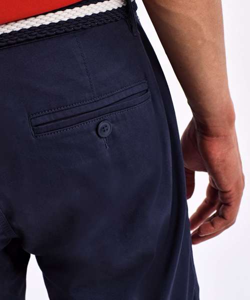 Classic fit. 98% cotton, 2% elastane. Side pockets. Small coin pocket. Welt back pockets with button closures. Belt loops. Zip fly with an extended buttoned closure.