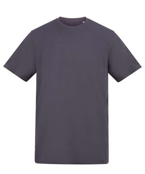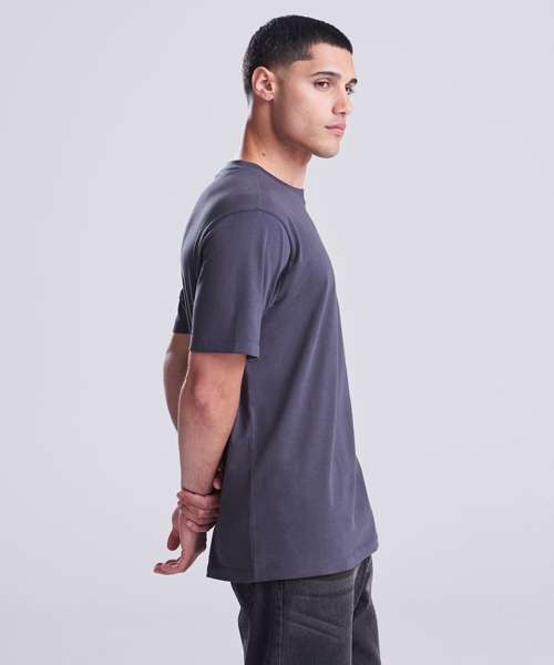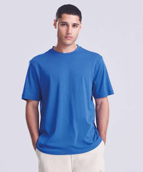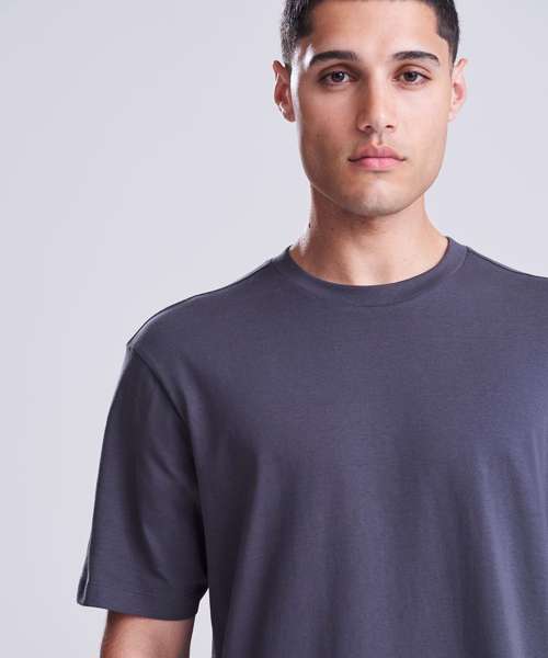 Relaxed fit T. Short sleeves. Side seams. PurePrint BC Cotton fabric. Taped back neck. Twin needle stitch details. Ribbed crew neck.
