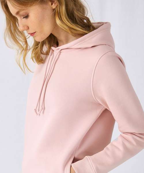 Trendy organic hooded sweatshirt with retail fashion oriented look and feel. Strong styling with great fitting and perfect length. Pockets placed in side seams to allow maximum front decoration surface area. Side seams ensure the best fit and a feminine silhouette. Identical colours (20) for men and women for a perfect duo. Visible "Hi! I'm Organic" neck tab to highlight the organic value of the garment. Easy branding solution - B&C No label solution. Inside single Jersey halfmoon in back to allow easy branding personalisation. Retail like features: single Jersey lined hood, qualitative herringbone neck tape and fashionable drawcord.
