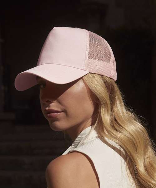 100% Cotton front panel and peak. 100% Polyester mesh rear panels