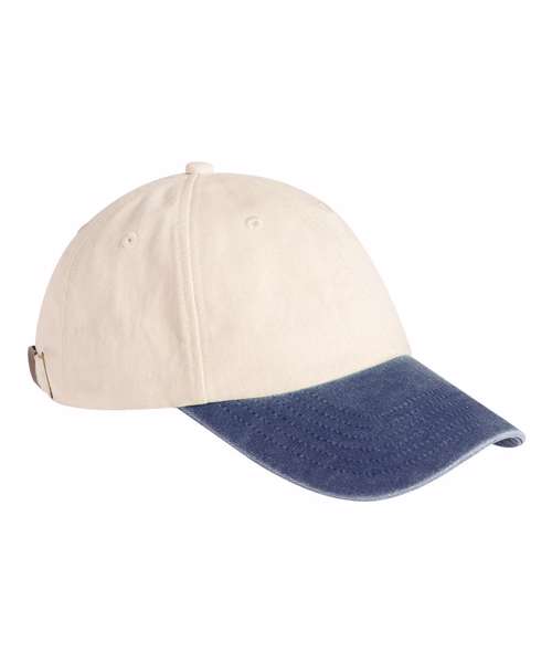 Contrast detailing. Vintage styling. Low-profile 6-panel design. Soft, unstructured crown. Pre-curved peak. Stitched ventilation eyelets. Self-fabric strap with brass-effect buckle. TearAway label for easy rebranding.