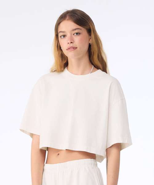 Cropped, boxy fit. Oversized sleeves. Double-needle cover stitch. Cotton thread. Side-seamed. Tear-away label. 18 singlets.