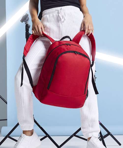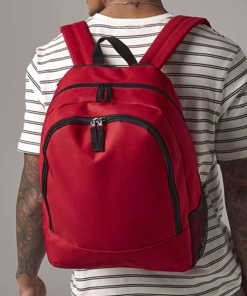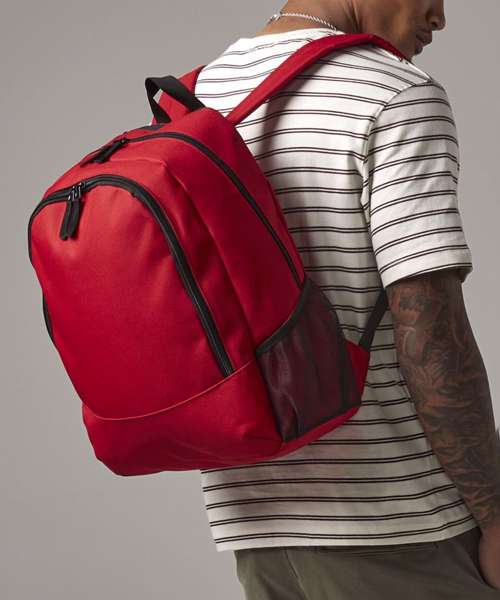 Padded adjustable shoulder straps. Zippered top pocket. Internal organiser section. Padded back panel. Side mesh pocket. Grab handle. Large internal pocket.