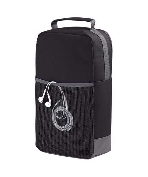 Water-resistant fabric. Wipe clean interior. Rear mesh pocket. Metal ventilation eyelet. Grab handle.