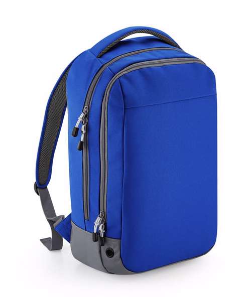 Water-resistant fabric. Wide zip opening for easy access. Front pocket organiser section. Internal slip pocket. External bottle pocket. Secure wireless headphone holder. Easy-access attachment clip. Metal ventilation eyelets. Breathable padded mesh back panel. Ergonomically designed straps for everyday comfort. Padded grab handle. TearAway label for ease of rebranding.