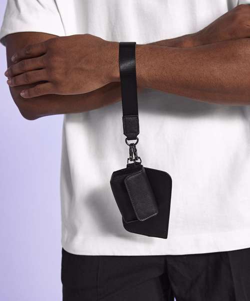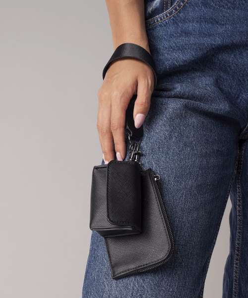 Saffiano fine grain. Three-piece product. Air pod case with a press-stud opening. Webbing wristlet strap. Zipped card wallet. High-shine gold metal trims. Compatible with bags and accessories from the Boutique Collection. TearAway label for ease of rebranding.