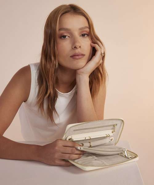 Protective velvet lining. Saffiano fine grain. Necklace compartment. Four secure necklace hooks. Detachable earring organiser. Ring holder. Two secure zip pockets. High-shine gold metal zip. Designed to store rings, earrings and necklaces.