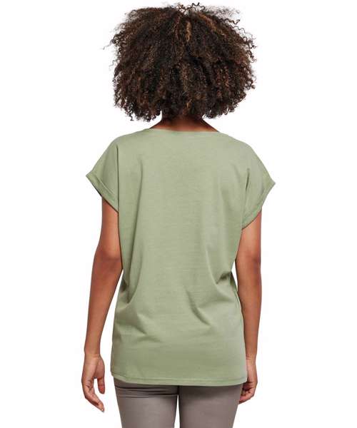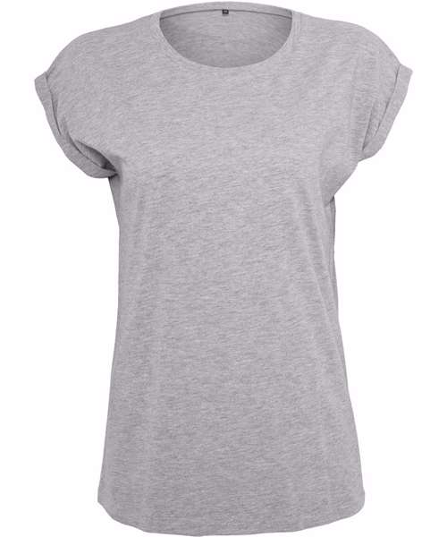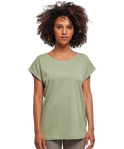 The women's extended shoulder tee from Build Your Brand offers a round-neck line, small rib cuff, extended shoulders and turn-up sleeves. This combination of features creates a sporty and trendy look. The light single Jersey and long cut ensure a comfortable fit. This product is ideal for rebranding, print and embroidery.