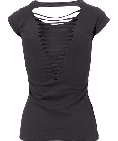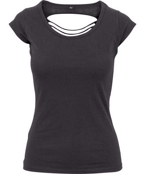 The Women's back cut tee is a feminine shirt with cool v-shaped cut-outs in the back. A large rounded scooped neckline and short sleeves complete the look. The lightweight single Jersey is ideally suited for embellishment and printing.
