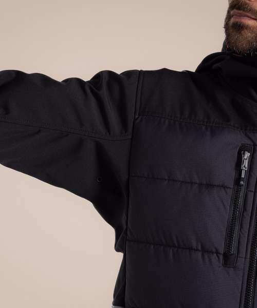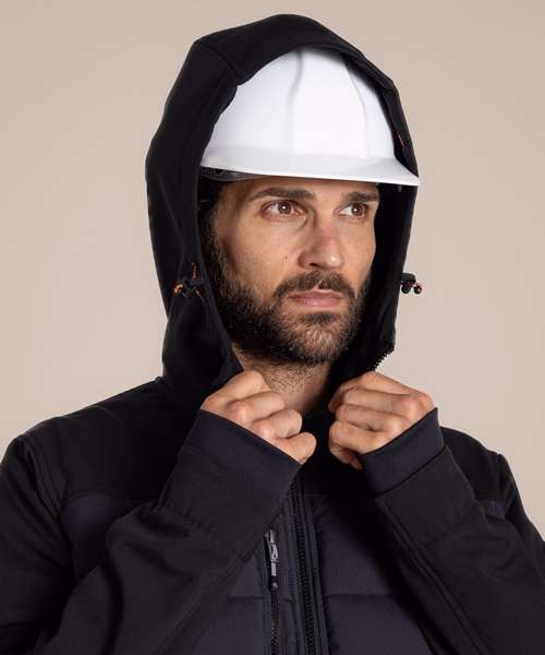 Designed to deliver effortless warmth in cooler conditions, this durable hooded jacket is a great workwear staple. Its stretch softshell construction features a snug microfleece back with baffled body panels for extra core insulation. The H2OShield DWR finish helps to shrug off showers, while odour-control panels help keep you fresh.