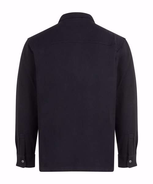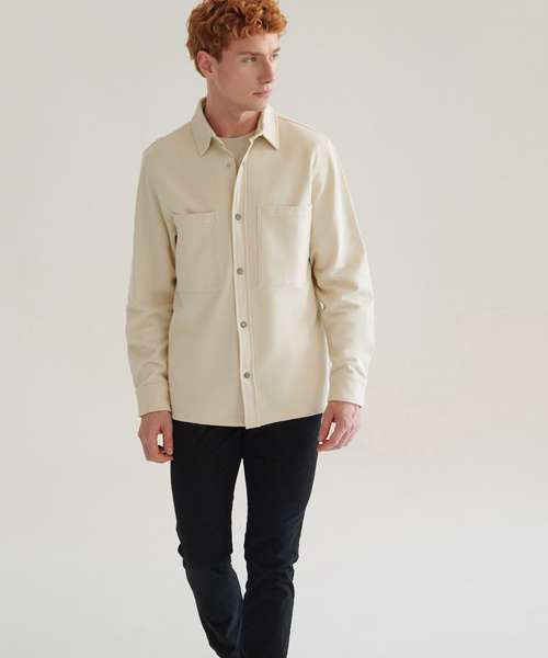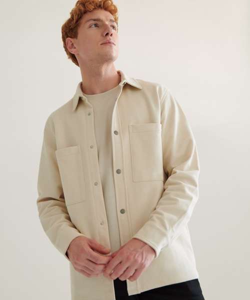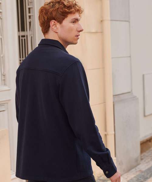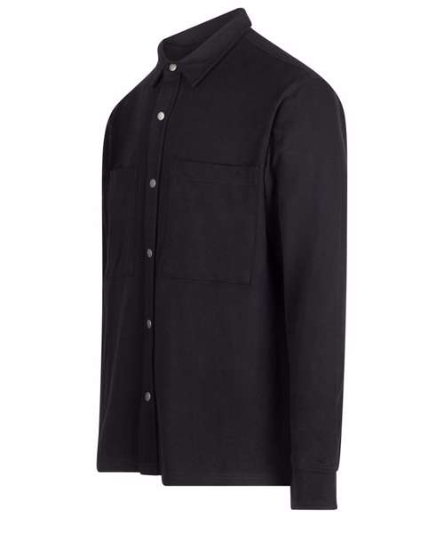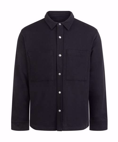 Piqué overshirt-style outer fabric. Brushed back fleece on the inner. Contemporary styling. Two front chest patch pockets. Metal stud fastening at centre front and cuffs. Back yoke. Regular fit. Tag-free for easy rebranding.