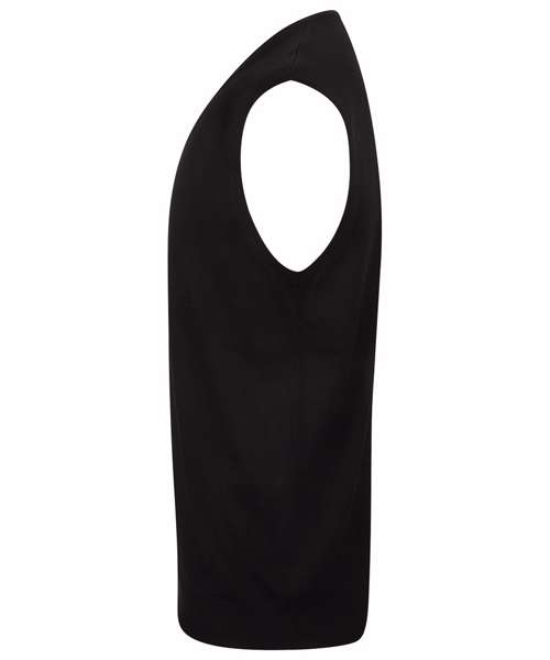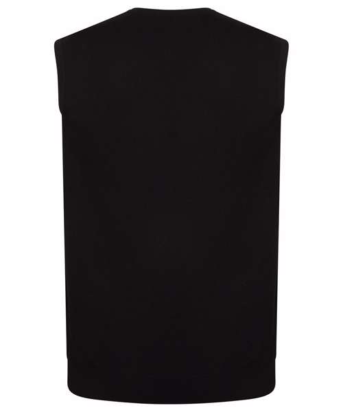 Fine knit. 12 gauge sleeveless v-neck jumper. Semi fashion neck detail. 1x1 rib and cuff.