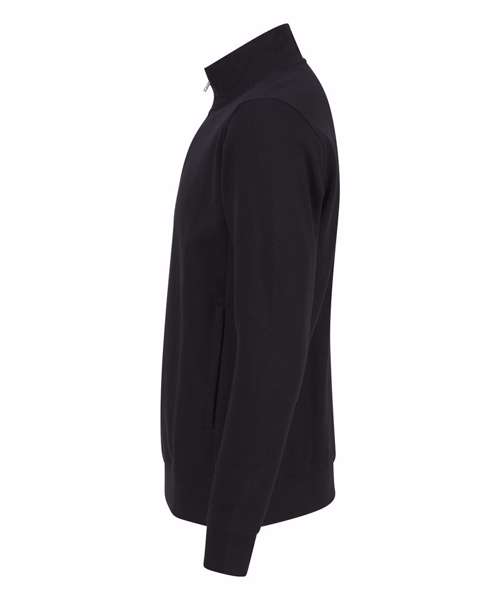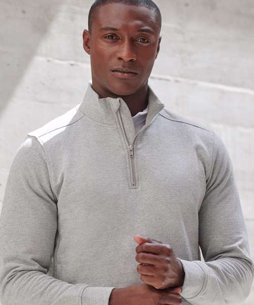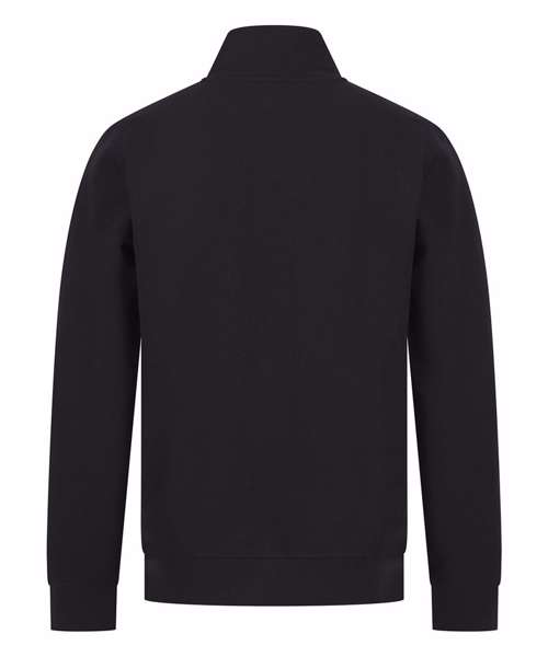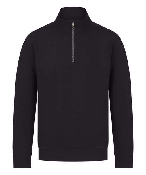 Sweatshirt made from fabric using recycled materials. Regenerated cotton mixed with recycled polyester. Brush back fleece. Set-in sleeves. 1/4 zip metal front zip. Ribbed cuff and hemline. Regular fit. Two in-seam, side-zipped pockets. Side panels. Henbury cut-out label for easy rebranding.
