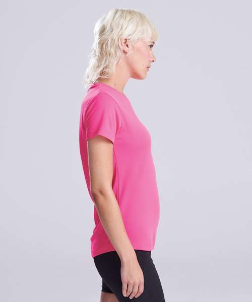 AWDis’ own Neoteric™ textured fabric with inherent wickability and quick drying properties. Self-fabric crew neck. Set in sleeve design. Girlie fit. Curved back hem for added comfort. Fabric collar and cuffs. Self-fabric taped back neck. Simple tear off label makes it perfect for rebranding. UPF 30+ UV protection.