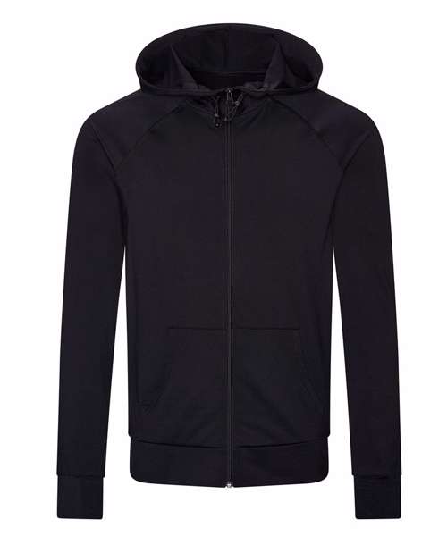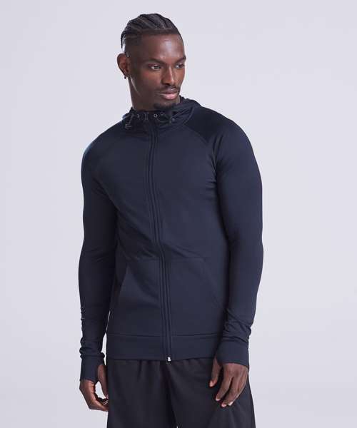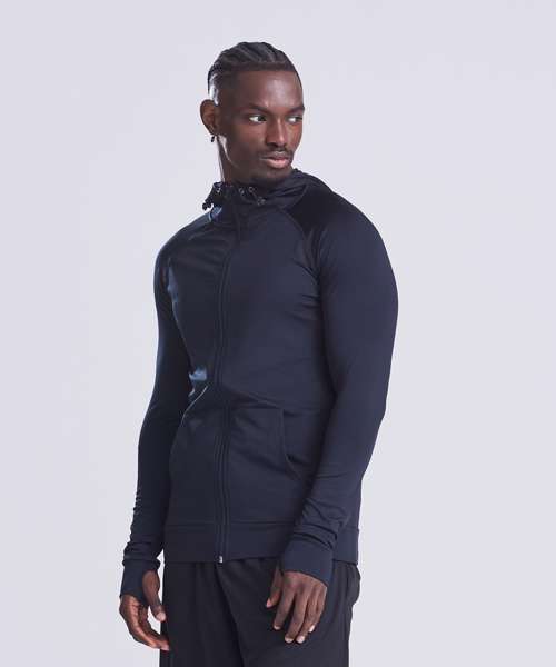 Sports zoodie with adjustable drawcords hood, raglan sleeves with thumb holes and full-front zip. Contrast fabric on sleeves and body.