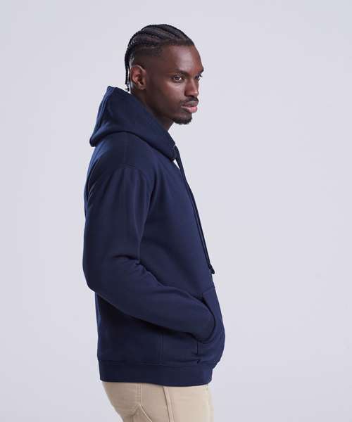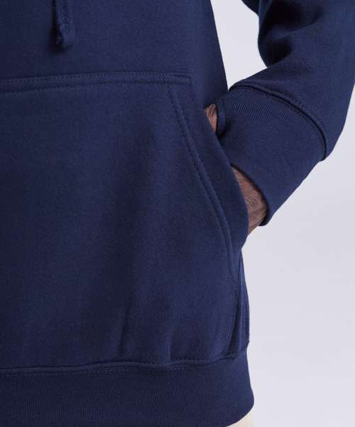 Heavyweight hoodie with twin needle stitching detailing and three panel double fabric hood with thumb holes in the cuffs. Flat lace drawcords and kangaroo pouch pocket and hidden phone pocket inside kangaroo pouch pocket with small opening for ear phone cord feed. Hidden ear phone loops with v-neck insert detail with hanging loop at back neck, locker patch and ribbed cuff and hem. Soft cotton faced fabric creates ideal printing surface. Simple tear out label makes it perfrect for rebranding. Brushed inner fleece.