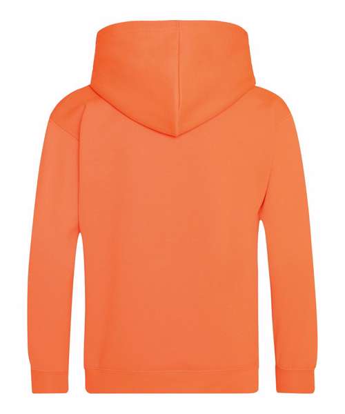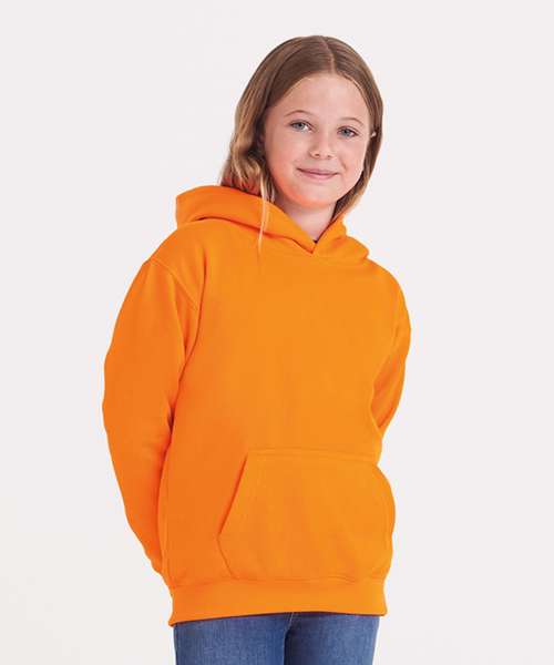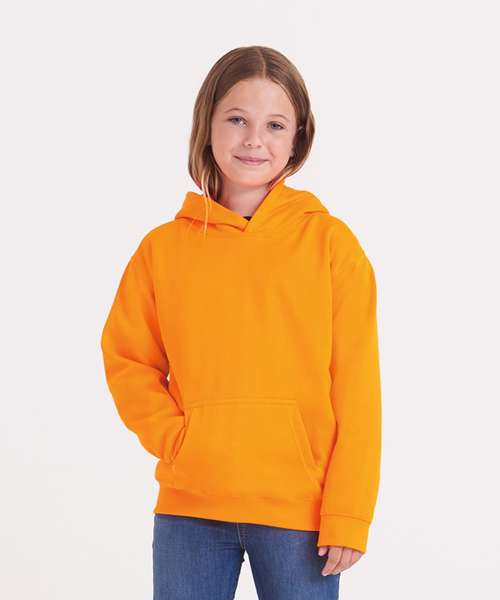 Vibrant eye-catching colours. No drawcord to comply with EU regulation. Twin needle stitching detail. Kangaroo pouch pocket. Ribbed cuff and hem. Simple tear-out label. Brushed inner fleece.