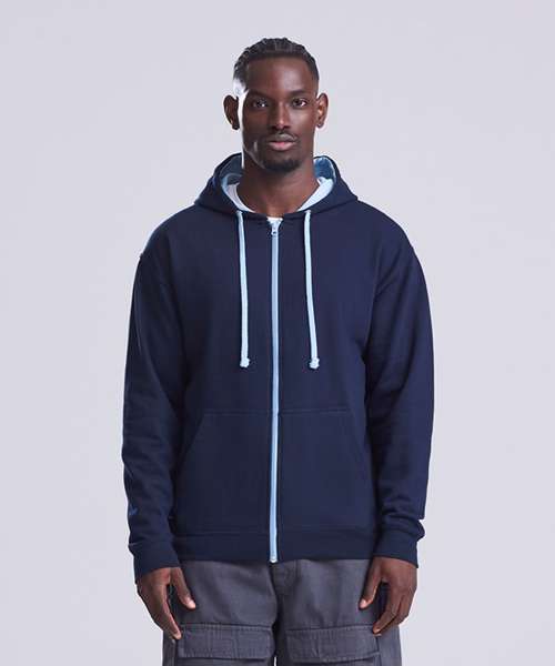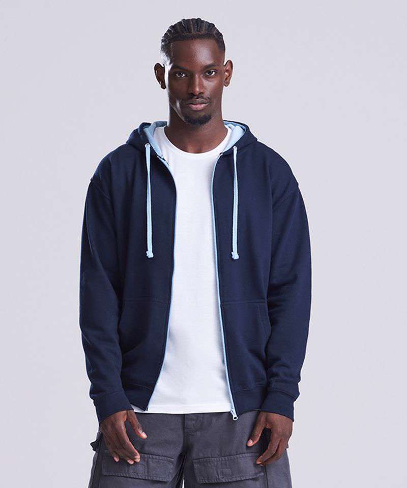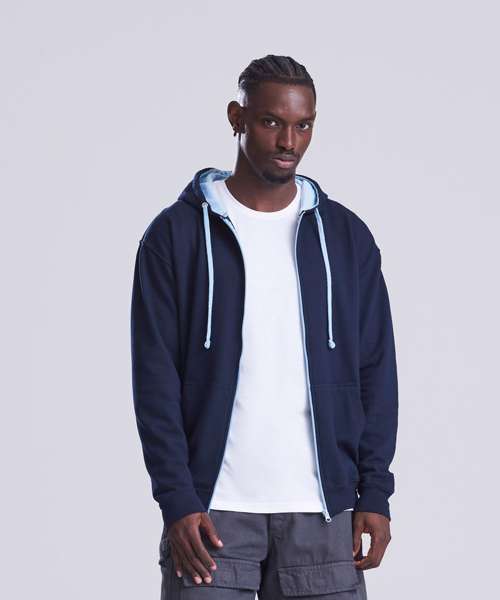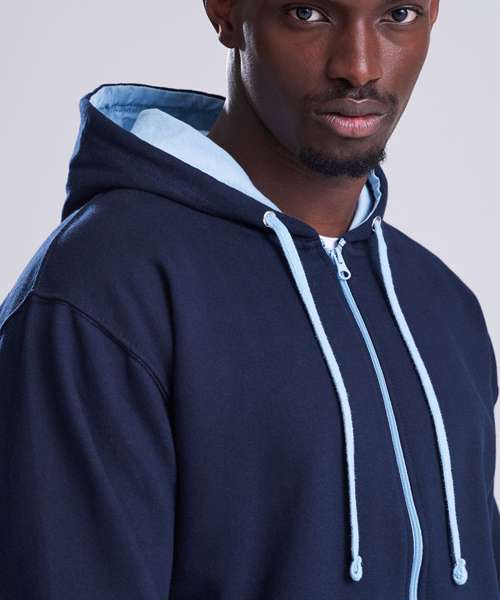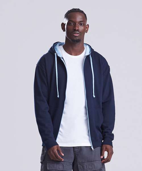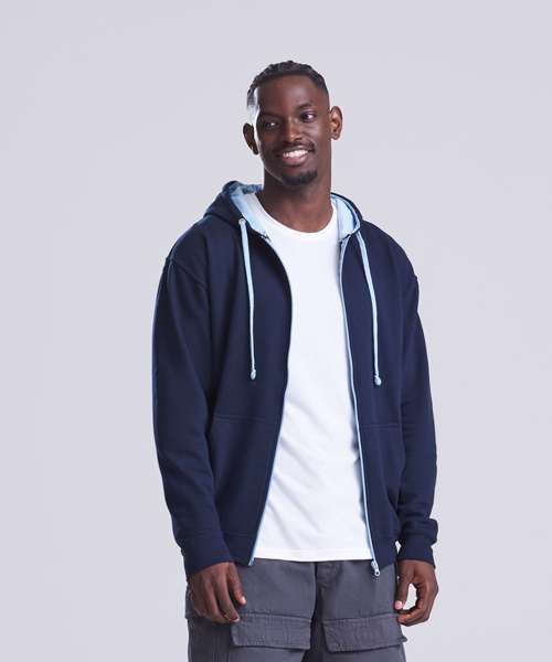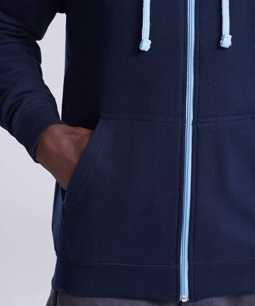 Full zip hoodie with contrast plastic zip. Twin needle stitching detailing. Double fabric hood with contrast inner. Contrast flat lace drawcords. Kangaroo pouch pocket. Ribbed cuff and hem. Soft cotton faced fabric creates ideal printing surface. Simple tear out label makes it perefct for rebranding. Brushed inner fleece.