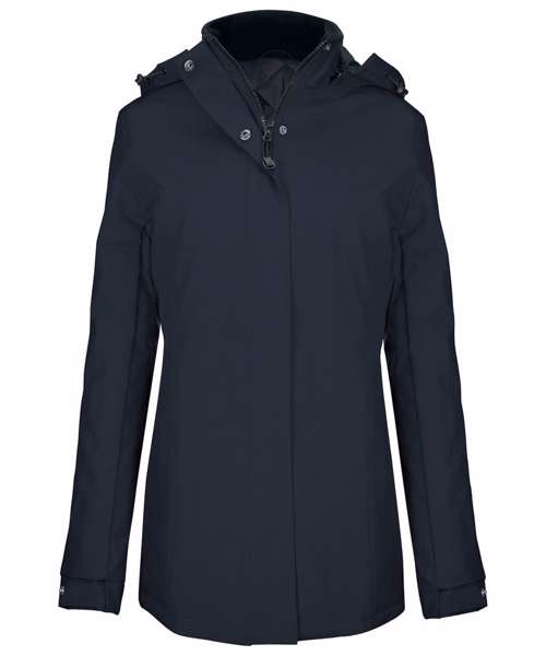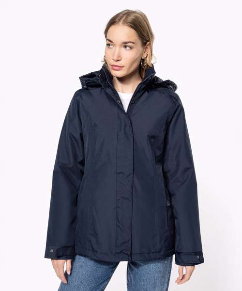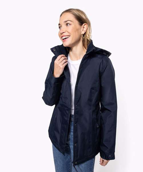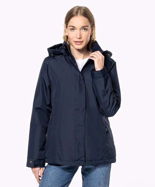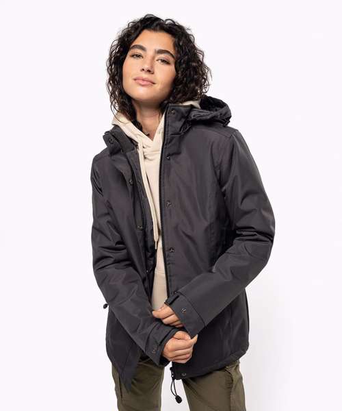 Zip fastening with invisible tab and press studs. 2 zipped outside pockets. 1 inside pocket. Detachable hood. Fleece lined collar. Zip access for decoration. BSCI certified.