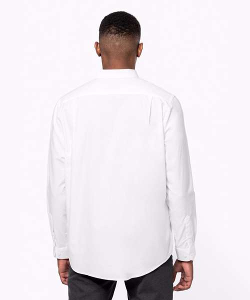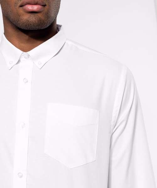70% Oxford cotton/30% polyester. Easy-care fabric. Button down collar. Matching buttons. V-shaped left chest pocket. Double back yoke with 2 side pleats. Adjustable rounded button cuffs with button placket. 2 spare buttons. Shaped hem. Certified STANDARD 100 by OEKO-TEX® N° CQ 1007/7, IFTH.