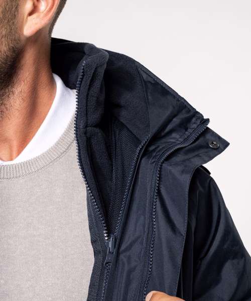 100% Polyester outer with PVC coating. Water-resistant taped seams. 3-in-1 parka: dual-composition padding. Body: 100% polyester mesh. Sleeves: 100% polyester. Zip fastening and press stud placket. Fleece-lined neck. 3-zip pockets at the front with flap. Tear release adjustable cuffs. Press stud removable hood with mesh lining and stoppers. Inner zip access for decoration. Fleece jacket: 100% microfleece polyester. 100% polyester sleeve lining for easy removal. Zip fastening. 2 side pockets. Fleece jacket detachable by zip. BSCI certified.