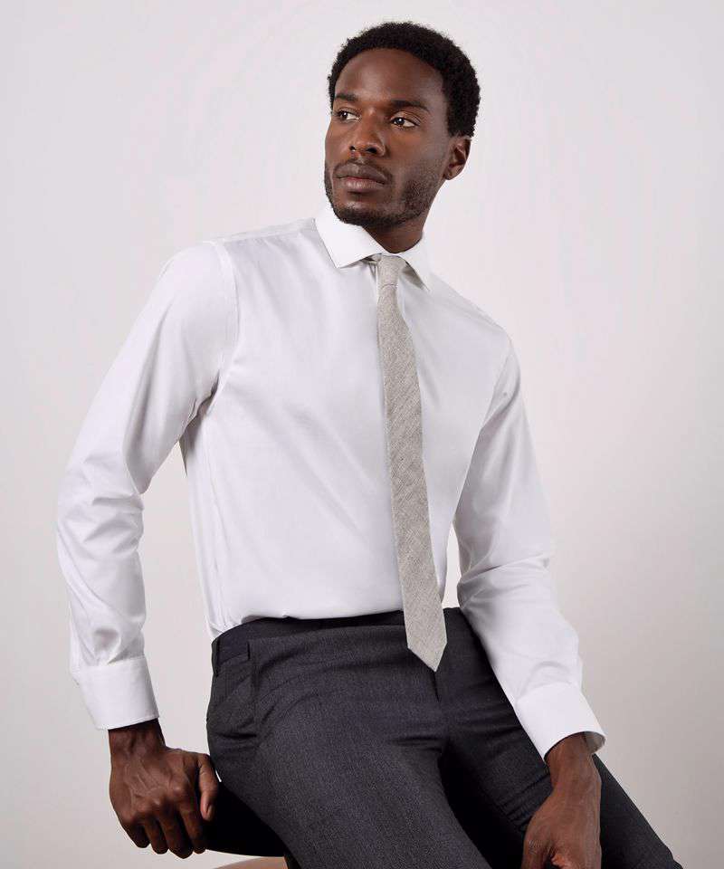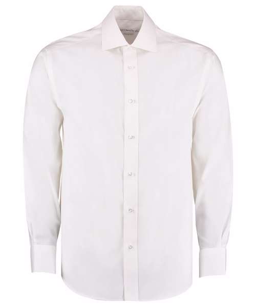 Fused stand-up semi cutaway collar with removable collar bones. Easy iron. Double-stitched sleeve and side seams. Single-stitched yoke and armholes. Two pleats at back. Rounded hem. Two button cuff with no button cuff placket. Spare button. Kustom Kit® woven back neck label.