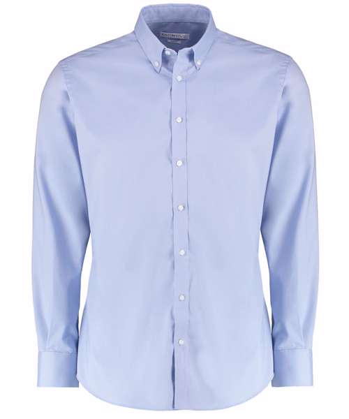 Fused stand-up button down collar. Two darts at back. Rounded hem. Back yoke. Two button cuff with buttoned cuff placket. Single stitched yoke and armhole. Spare buttons. Kustom Kit® woven back neck label.
