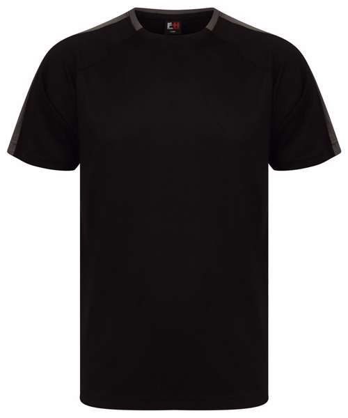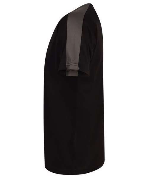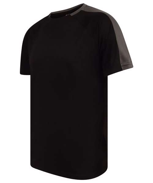 Unisex team t-shirt with self-fabric contrast colour sleeve panels. Sports fit. Wicking finish provides moisture management. Quick-dry and breathable. Self-fabric 2-piece collar. Raglan shoulder. Tear-out label for easy rebranding.