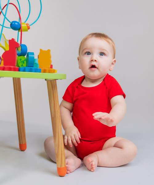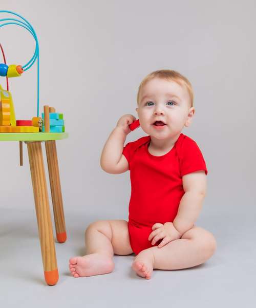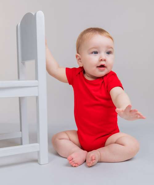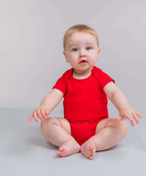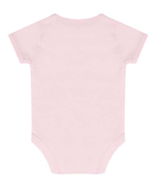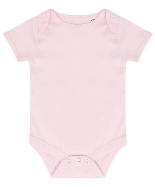 Super soft baby short-sleeved bodysuit with an easy access envelope neck and YKK popper fastening at bottom. Size tab only for easy relabelling.