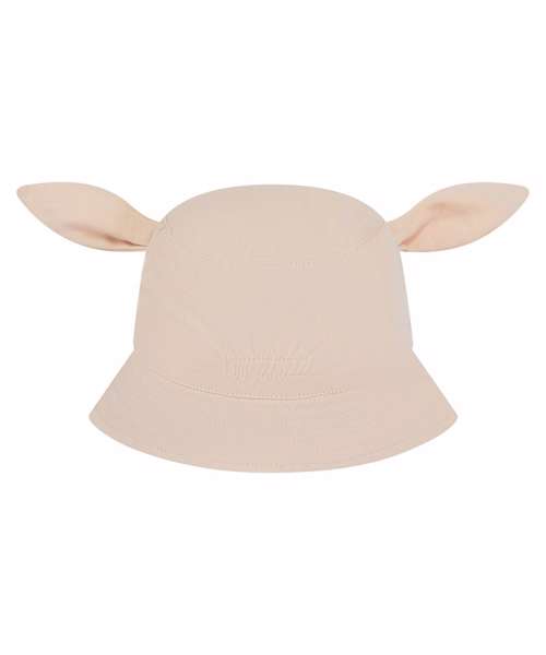 Kids bucket hat with embroidered character facial features. Two colourways in different animal styles. Top-stitched brim detail. Flat top. Elasticated back. Suitable for decoration.