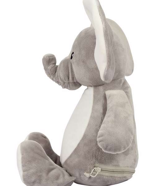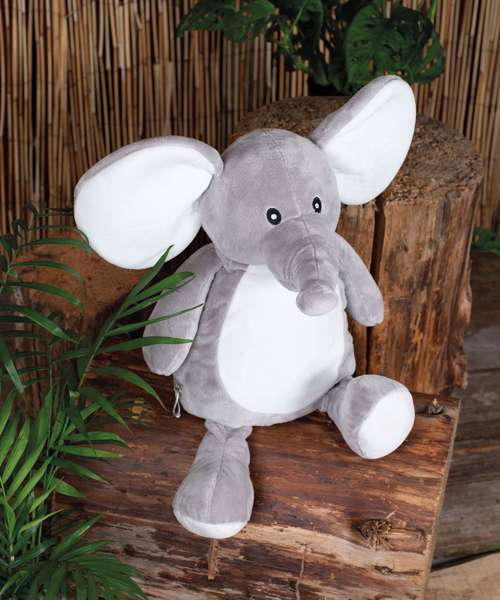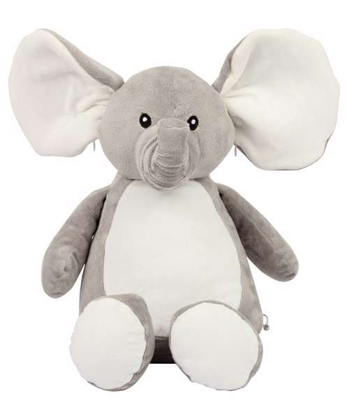Soft plush elephant. Contrast cream inner ears, feet, and front panel. Sewn eyes. Zip access on base for direct access onto the tummy for decoration. Removable inner stuffing. Zip access to both ears for decoration onto the ears. Can be embroidered or sublimation printed. Complies with EN71 European Toy Safety regulations. Remove all hang tags and their fasteners before giving these items to a child. Suitable for children of all ages.