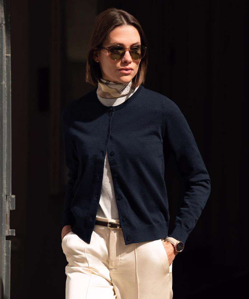 The Women’s Brighton cardigan is a timeless wardrobe staple, blending understated elegance with soft comfort for effortless everyday style. Knitted from certified organic cotton with a touch of polyamide (nylon), this fine-gauge knit offers excellent shape retention and a smooth, modern fit. It’s perfect for layering across seasons, providing soft comfort whether worn over a shirt for a polished look or paired casually with everyday essentials. Designed with a feminine round neckline, set-in sleeves and tone-in-tone buttons, plus rib at the sleeves and bottom hem, the Brighton cardigan delivers a sleek silhouette with refined simplicity.