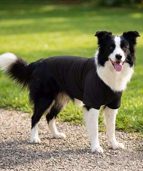 Pullover, stretchy t-shirt, raglan sleeves. Adjustable back leg straps. Reinforced slit so it can be worn over the harness. Back length – XS: 25cm; S: 30cm; M: 35cm; L: 40cm; XL: 45cm; 2XL: 50cm.