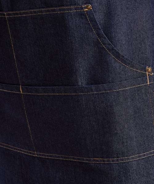 Denim bib apron with contrast stitching. Adjustable buckle on the neckband. Copper rivets. Four pocket compartments. 86cm long and 72cm wide.