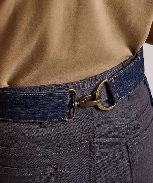 Hip apron with adjustable self-fabric waistband. D-ring and carabiner fastenings. Jeans style stitched pockets. Zipped pocket.