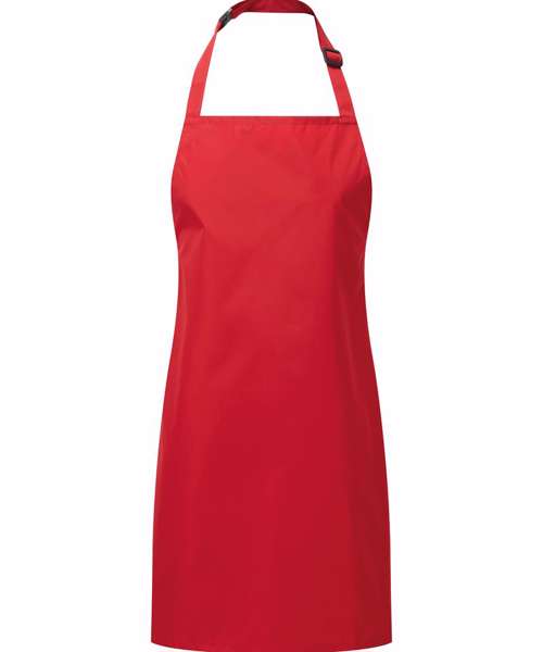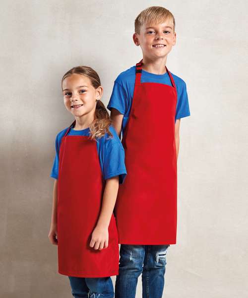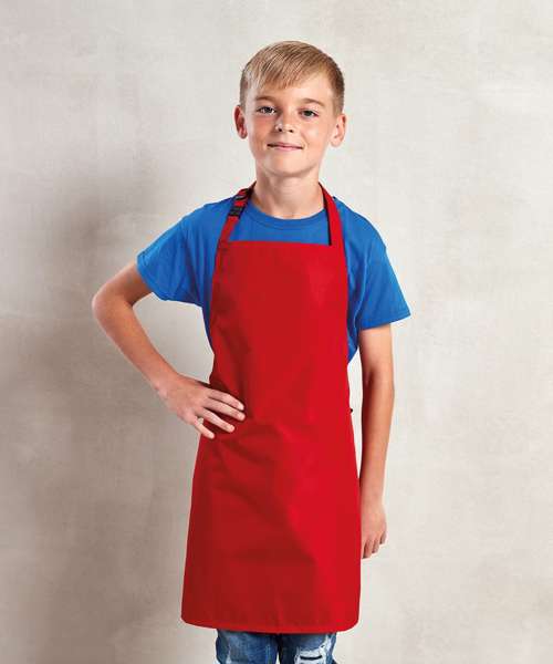 Waterproof bib apron. Self-fabric neckband and ties. Adjuster and safety release mechanism on the neckband. Infant and Junior sizes.