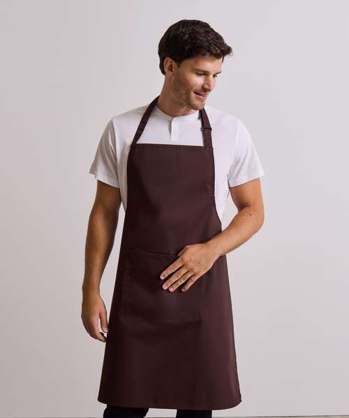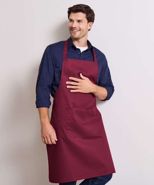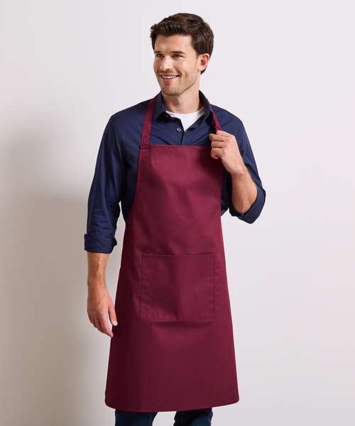 A classic bib apron that features a useful centre pocket with built in pen pocket, making this style a popular choice for waiting staff. Available in 42 colours from the Premier 'Colours Collection', this apron has a sliding adjustable buckle on the neckband so the wearer can adjust the overall length.