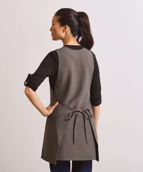 A very attractive and stylish wrap around tunic that offers businesses an alternative solution to traditional tabards and tunics. An over the head style that fastens from the back to front on the underside, then wraps back on itself and ties neatly at the back. This style is cut to flatter the female figure and features a v –neck and side vents which allow complete ease of movement.