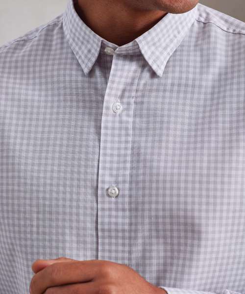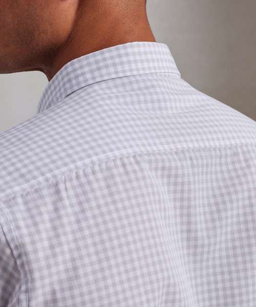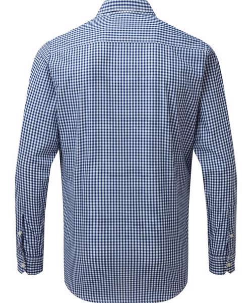 Yarn dyed fabric creating a gingham pattern. Long sleeve with single button cuff and sleeve guard. Narrow soft collar with button-down options on the underside. Semi fitted. Easycare fabric.