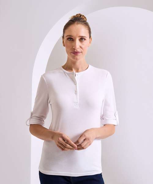 Long sleeve tee that has roll sleeve capabilities with button tab on the inside of the sleeve to secure in place. Round neck style with a three button placket. Twin-needle stitching to the hem and cuff.