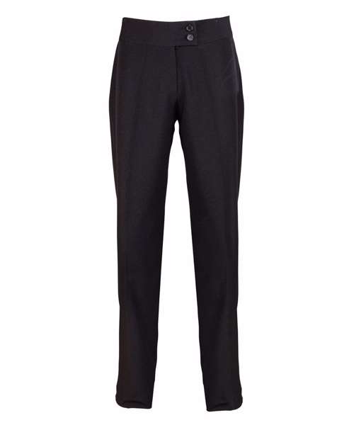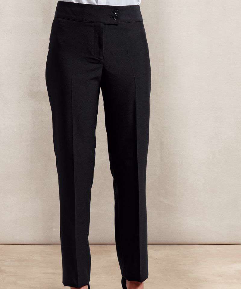 A straight leg trouser for women that features a deep waistband with cross-over tab and with two button fastening. Available in two leg lengths and four colours, this is great all round uniform trouser for women.