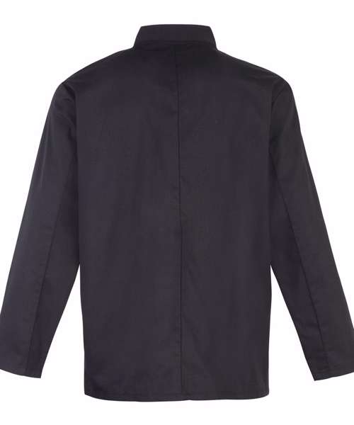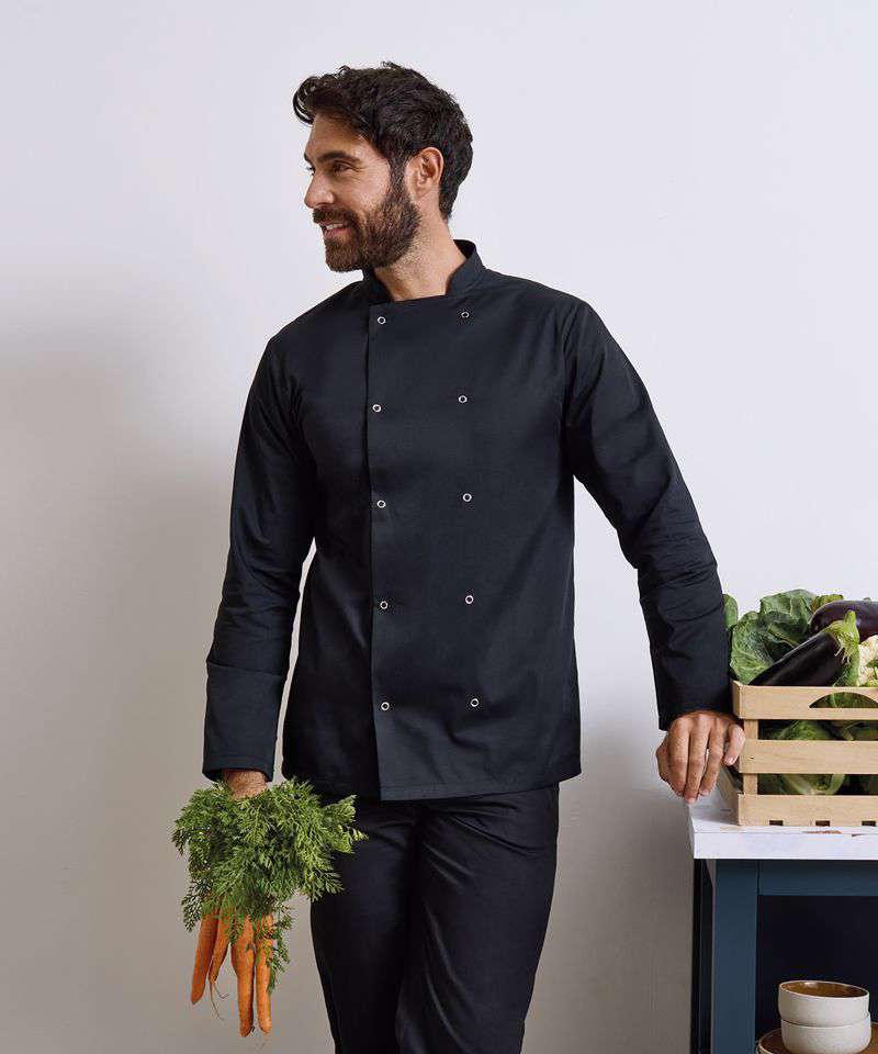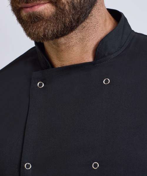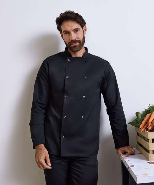 This long sleeve jacket fastens with pop studs for an easy-wearing jacket for chefs. The unisex styling and soft hand feel makes this style a popular choice for kitchen staff.