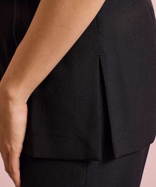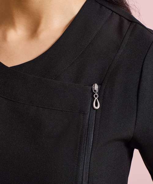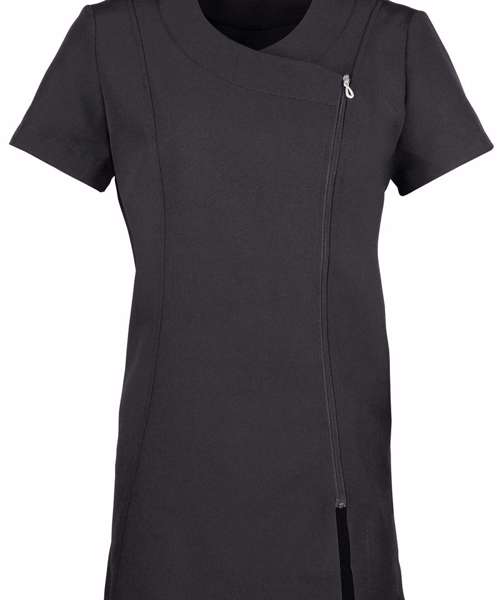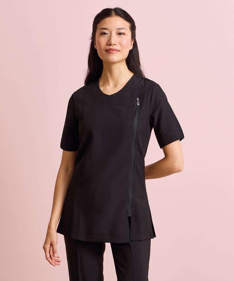 Beauty and spa tunic with cross over neckline and asymmetric zip front. Short sleeve with vented cuff. Side vents. Princess seams with topstitch detail for flattering fit. Easycare.