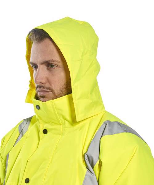 Certified to EN ISO 20471 Class 3, EN 343 Class 3:1. Two hip pockets with flaps. Drawstring hood. Knitted storm cuffs. Taped waterproof seams. Two-way zip front with studded storm flap. Inside pocket. Mobile phone pocket. Print access.
