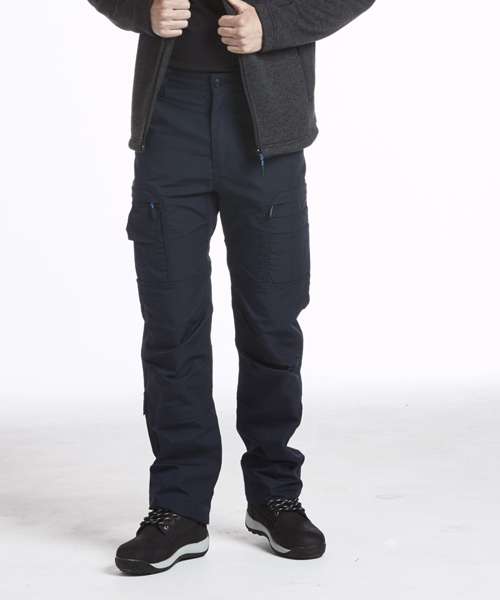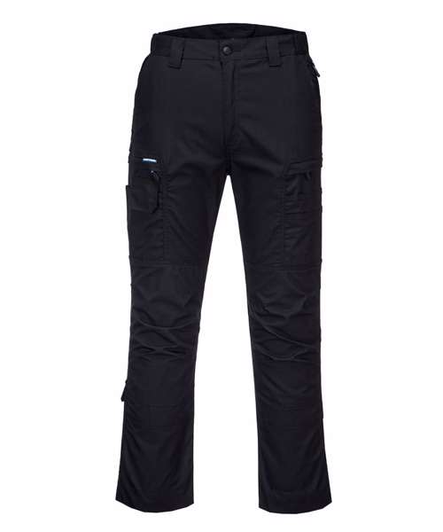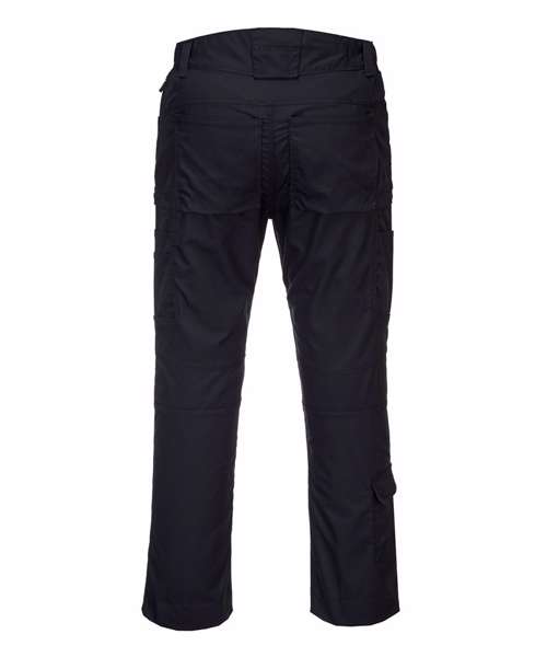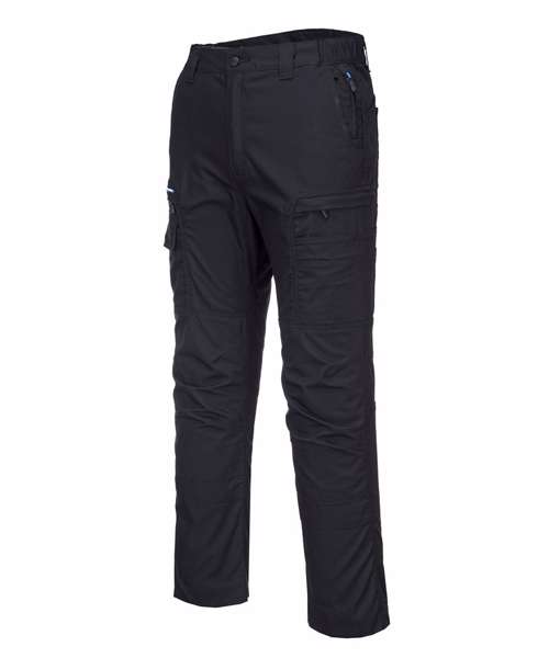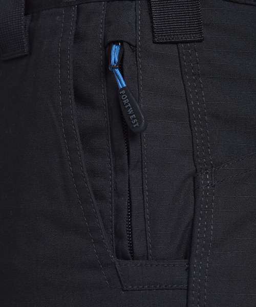 Rule pocket. Triple-stitched seams. UPF 50+. Side elastic waist. Smart phone pocket. 14-pockets. Bar tacked at all stress points. Two tier knee pad pockets. Adjustable leg length. Registered Community Design. High rise back waistband. Crotch gusset. Lower back leg pocket. Zip fly with Portwest branded stud button. Pre-bent knees. Webbing belt loops. Zipped side thigh pocket. Stretch ripstop. Contemporary design with an ergonomic cut.
