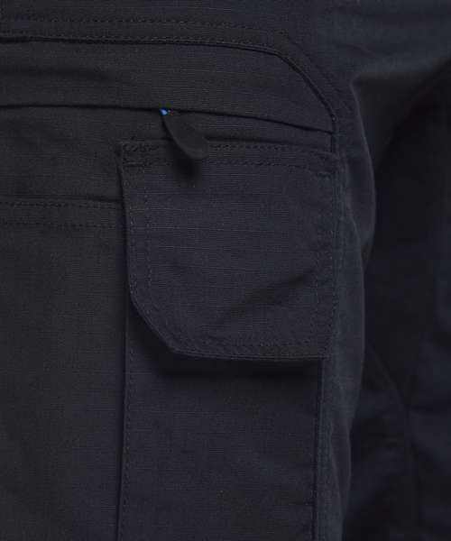 Contemporary work trouser made from highly durable ripstop fabric that stretches as you move. Subtle articulation on the knees allow for increased freedom of movement and a high rise back waistband ensures protection in all working positions. Packed with functionality including pre-bent knees a crotch gusset two tier knee pad pockets and an adjustable leg length for added convenience. Multi-functional thigh pockets provide secure storage of phones pens and tools.