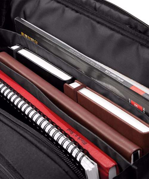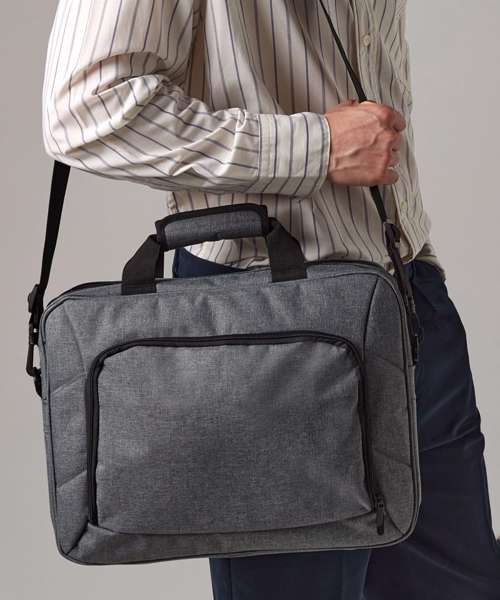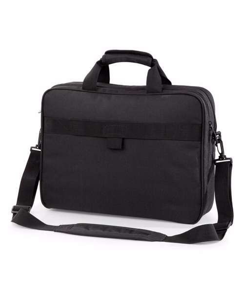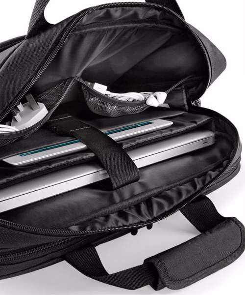 Triple compartment design. Laptop compatible up to 17". Padded laptop compartment. Document section. Detachable adjustable shoulder strap with pad. Zippered front pocket. Organiser section. USB memory stick loops. Wheelie bag strap. Padded handle. iPad mini/Tablet compatible.