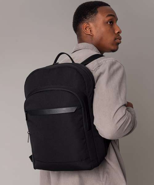 Minimalist styling. Zipped main compartment. Wide zip opening for easy access. Internal padded tablet/laptop sleeve up to 13". Zipped internal mesh pocket. Two internal slip mesh pockets. Internal bottle hoop. Premium finish internal lining. Outer zipped front pocket with rain flap and internal slip pockets. Luggage strap with discreet zipped pocket. Grab handle. Underseat cabin luggage size – suitable for most airlines (40 x 30 x 20cm). TearAway label for ease of rebranding. 100% certified recycled polyester fabric.